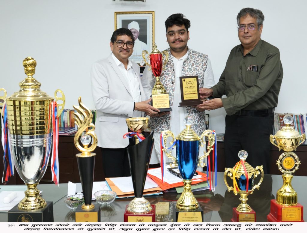 गत दिवस दिल्ली आईआईटी में आयोजित संविधान सभा की बैठक में भी जीएलए के रौनक ने प्रथम पुरस्कार प्राप्त कर अपनी स्वर्णिम उपलब्धियों की श्रृंखला को और समृद्ध किया। इस वर्ष रौनक ने कुल 43 प्रतियोगिताओं में भाग लिया और सभी में प्रथम पुरस्कार जीतकर यह साबित किया कि कठिन परिश्रम और वक्तृत्व कौशल का संगम हमेशा सफलता का मार्ग प्रशस्त करता है।